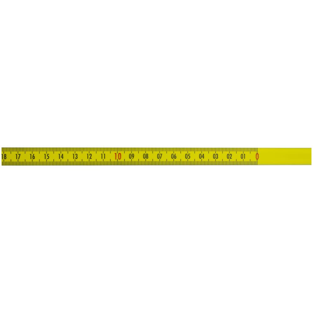 Selvklæbende målebånd i stål med dobbeltsidet klæbebånd. Kontinuerlig gradering af mm og cm. Sort graduering i top og bund. Løbende cm mærket med sorte tal. Løbende meter mærket med røde tal. Båndbredde 13 mm (enkelte varianter 10 mm). Fås i flere længder samt højre-venstre eller venstre-højre graduering.