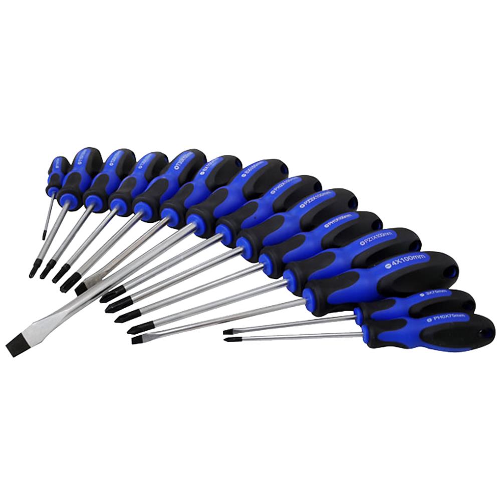 Basic skruestrækkersæt med 14 dele: lige kærv 3×75 mm, 4×100 mm, 6×100 mm, 8×150 mm, PH0×75 mm, PH1×100 mm, PH2×100 mm, PZ1×100 mm, PZ2×100 mm, Torx T10×75 mm, T15×100 mm, T20×100 mm, T25×100 mm, T30×100 mm.