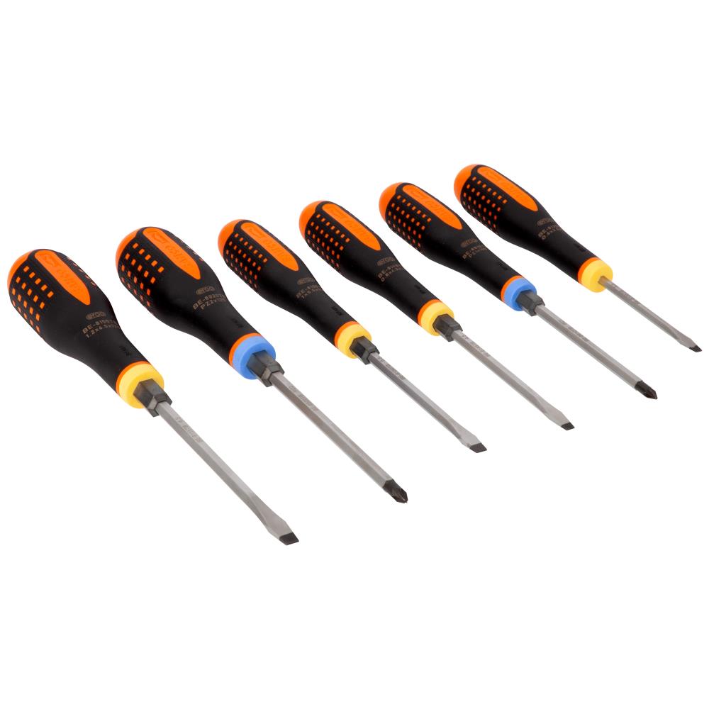 Ergo slagskruetrækkersæt med 6 dele til ligekærv, Pozidriv og sekskantskruer. Skruetrækkere med fosfateret spids og højtlegeret stålklinge, forkromet og helhærdet. Sekskantfatning på klinge til fastnøgle eller skiftenøgle til arbejde der kræver højere vridmoment. Klingen fortsætter op gennem håndtaget så energien fra slaget ikke går tabt. Metalhætten yder beskyttelse ved arbejde, der kræver højt vridmoment. 3-komponent håndtag af blødt materiale med nubret overflade for et godt greb og højere vridmoment. Facetslebet hoved, som forhindrer rulning. Nemt at vælge den rette spids med det farvekodede skaft og permanent symbol i den kugleformede ende. Sættet indeholder: ligekærv: 0,6 × 3,5 mm / 0,8 × 4,5 mm / 1 × 5,5 mm / 1,2 × 6,5 mm, Pozidriv: PZ1 / PZ2. Leveres i papæske.