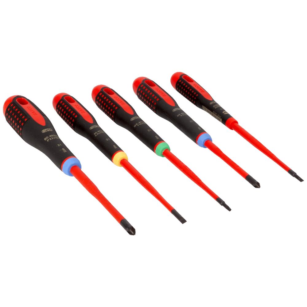 Ergo isoleret VDE-skruetrækkersæt med 5 dele til ligekærv-, Pozidriv- og Torxskruer. Klingeisolering støbt direkte på klingen. Spids med fosfateret finish giver præcis pasform og ingen afskalning. 3-komponent håndtag i blødt materiale med nubret overflade giver overlegen greb og større kraftoverførsel. Farvekodet håndtag og permanent symbol på enden af håndtaget. Integreret ophængshul. Til arbejde under spænding op til 1.000 V. Individuelt kontrolleret og fremstillet i henhold til IEC 60900, testet i et vandbad ved 10.000 V. Indhold: kærv VDE 3,0×100 mm / 4,0×100 mm, Pozidriv VDE PZ1×80 mm / PZ2×100 mm, Torx VDE T10×100 mm.