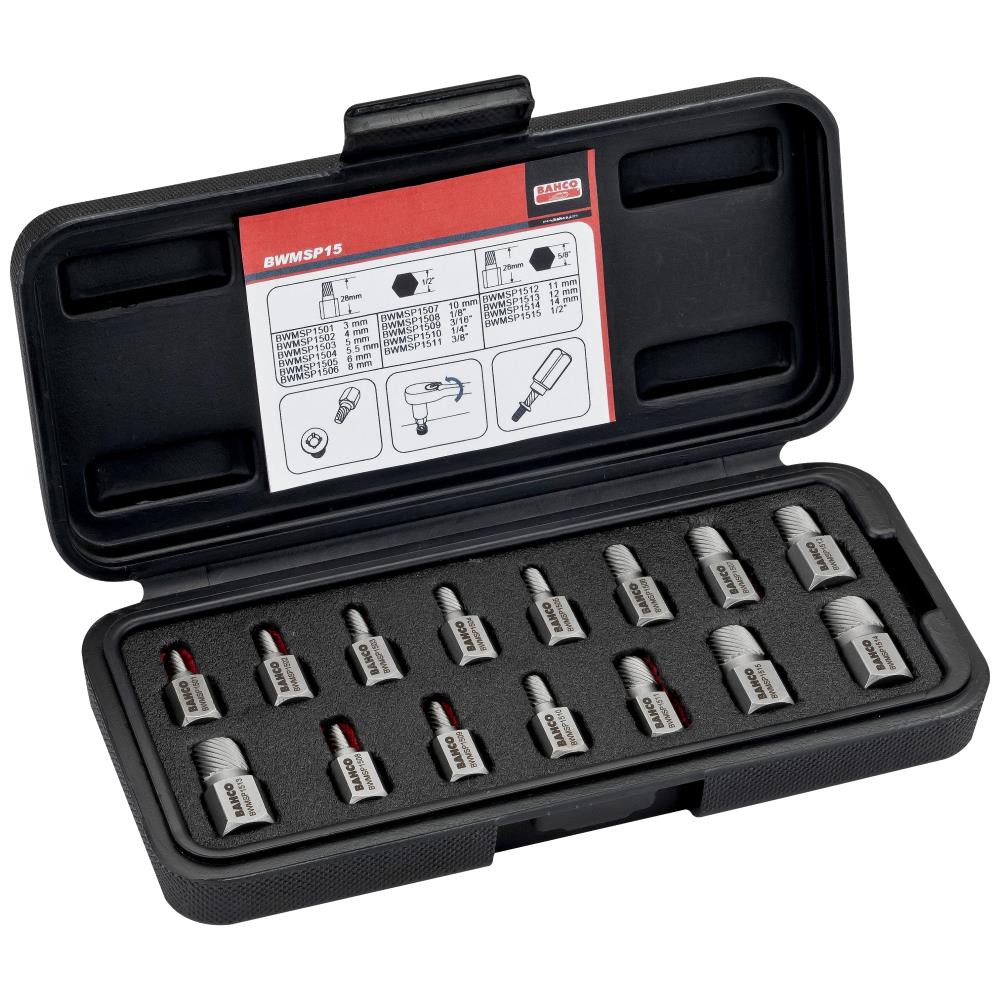 Skrueudtrækkersæt med 15 sekskantede udtrækkere og 15 bolte. Speciel kileform designet til at fjerne beskadigede eller ødelagte stifter, bolte, skruer og fittings til applikationer med høj moment. Aggressiv venstrehåndet spiraldesign for ekstra gribekraft. 11-delt 1/2″ sekskantede stikdåser med sekskantdrev – 11-delt til 13 mm stikdåser – 4-delt 5/8″ sekskantudtag – 4-delt til 16 mm udtag – 4-delt til 16 mm udtag. Dækskruer på 3-14 mm (1/8″ – 1/2″). Højtlegeret stål (Ni-Cr-Mo) materiale. Sandblæst (zinkfosfat) finish. Hårdhed: 51-54 HRC.