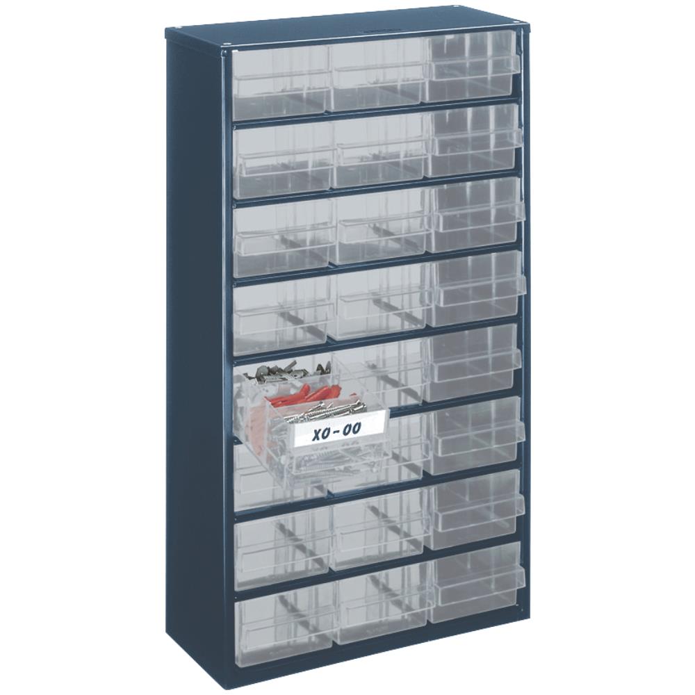 Skuffereol til mindre emner. Med skuffer af typen 150-00. Skufferne kan inddeles i rum ved hjælp af skillevægge (ekstra tilbehør). Kabinet i blålakeret stålplade og skuffer i transparent polypropylen. Fås i flere varianter.