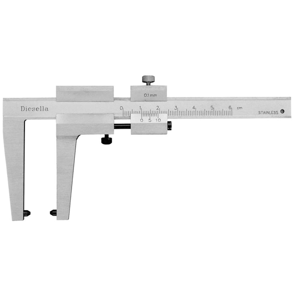 Skydelære til måling af bremseskiver på personbiler. Model med afrundet yderkant og finindstilling. Afrundet yderkant og med finindstilling. Udført i rustfri stål med matforkromet målestav og nonius. 0,1 mm aflæsning. Fås i flere varianter.
