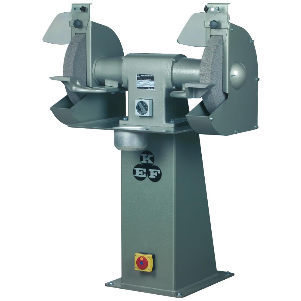 Kraftig industrislibemaskine PSD 14 med solid konstruktion og kraftfuld motor klarer de gængse opgaver og sikrer samtidig et godt arbejdsmiljø idet slibemaskinen både har et lavt mekanisk og elektrisk støjniveau. Søjlemodel med bord og vandkop. Spindelakslerne er nøjagtigt lejret med godt beskyttede støvtætte kuglelejer. PSD 14 leveres komplet med to slibeskiver i lukket skærm med store justerbare øjenværn og kraftige slibeanlæg af støbegods og er desuden forberedt til udsugning, der kan tilkøbes som ekstraudstyr. 3×400 V – 50 Hz. 2,7 HK motor med 1.400 omdr./min. Slibeskive ø350×50×32 mm korn 46/36.