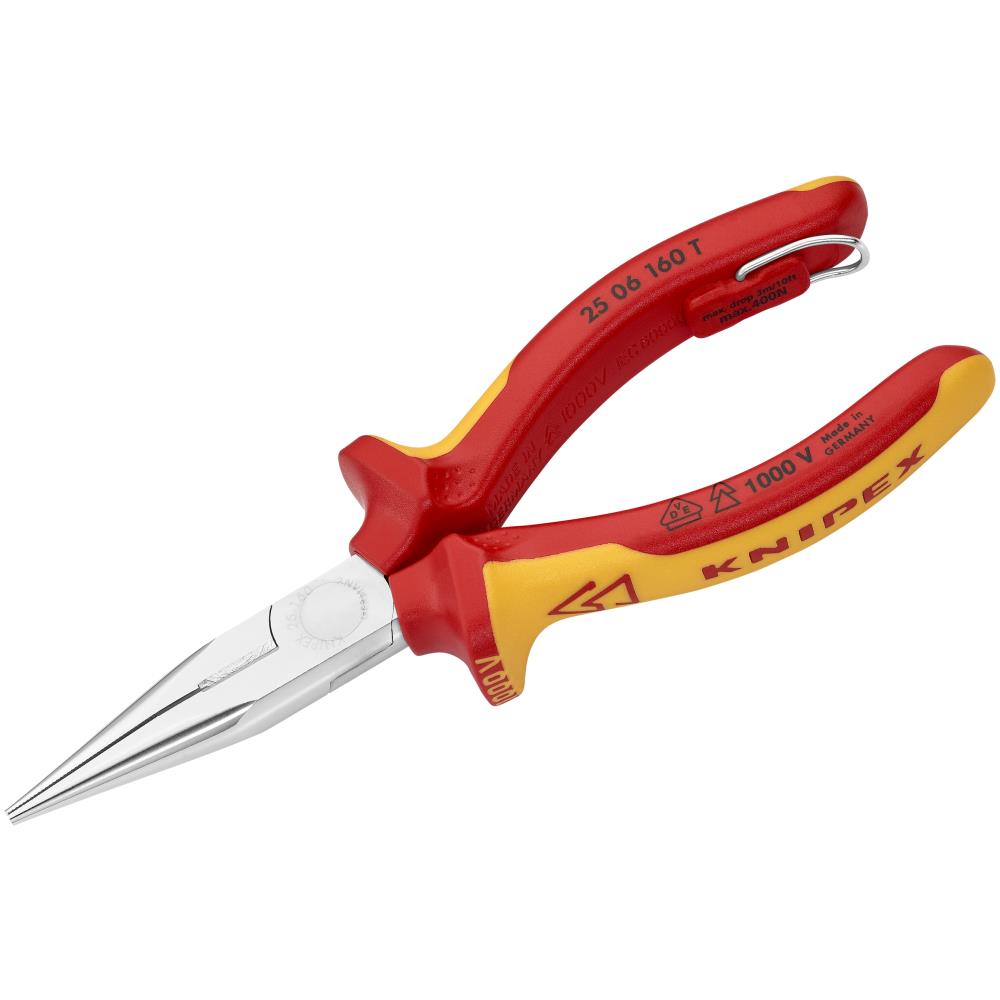 Forkromet, med isoleret greb med flerkomponent-håndtag, VDE-godkendt, med integreret isoleret fastgørelsesøje til brug for anbringelse af sikring mod nedstyrtning. Velegnet til gribe- og skærearbejder. Spidse, flad-runde kæber. Fortandede gribeflader. Med skær til blød, mellemhård og hård tråd. Skær yderligere induktivt hærdede, skærhårdhed ca. 61 HRC. Vanadin-elektrostål, smedet, oliehærdet i flere trin.