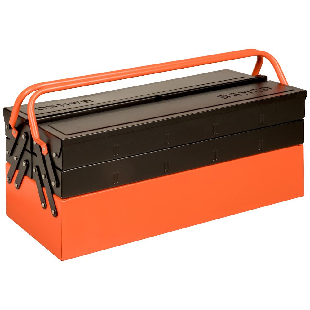 Værktøjskasse fremstillet i tungere målestål, hård pulverlakeret finish. Låget giver mulighed for påsætning af hængelås. 2 foldbare håndtag for kompakt opbevaring. Kassen åbnes let ved at trække i håndtaget og giver direkte adgang til alle værktøjsrum. Åbner op, så opbevaringsbakkerne vises – ingen bakker skal løftes ud eller skuffer åbnes. Forstærket bund. Galvaniseret. Fås i flere varianter.