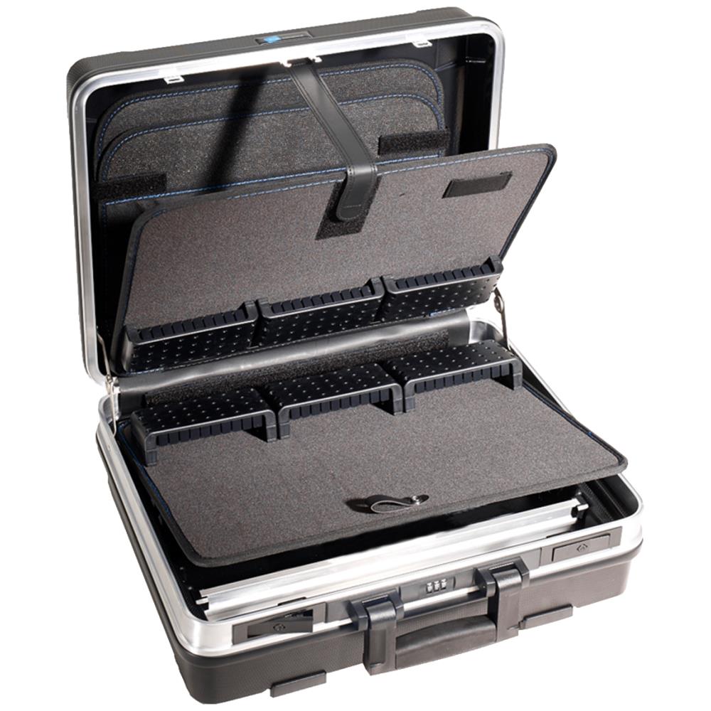 Base værktøjskuffert med værktøjsmoduler. Kufferten er fremstillet i slagfast ABS-plast med kraftig aluminiumsramme og gummilister. Nyt og moderne design med ergonomisk håndtag og A4-dokumentmappe i låget. Base er udstyret med to nøglelåse og en kodelås. Volume 26 ltr. Maks. belastning 25 kg. Leveres uden værktøj.