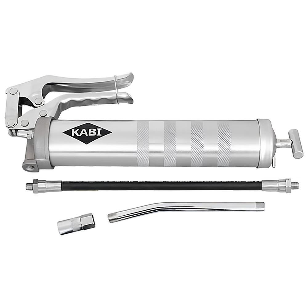 Enhåndsfedtpresse med smøreslange, smørerør og smørehoved. Smørepatronpistolen er fuldt udstyret med påfyldningsnipler, hvilket gør den egnet til patroner, løsfedt eller påfyldning via fedtpumpe. Gevind 1/8″R. Indhold 400/500 g. Pumpekapacitet 0,5 g/slag. Maks. tryk 345 bar. Inkl. 300 mm smøreslange, rør og 4-kæbes smørehoved.