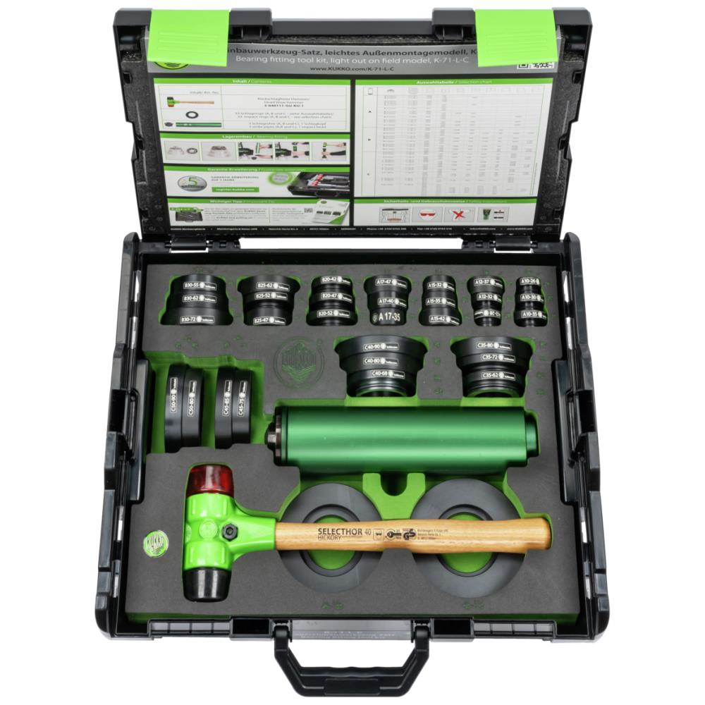 Monteringssæt til kuglelejer, 26-110 mm udvendig og 10-50 mm indvendig mål på lejer. Inkl. slagrør og dødslagshammer, komplet sæt leveres i praktisk kuffert med skumindlæg.
