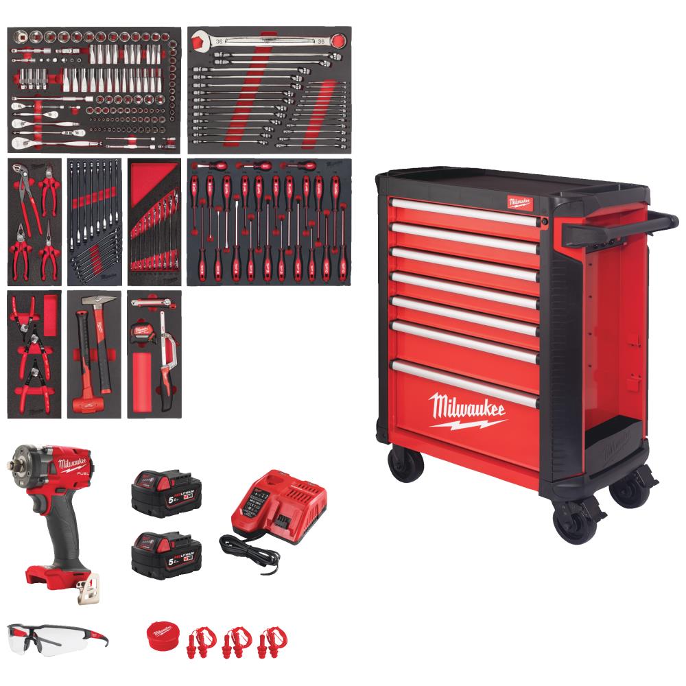 30″ Toolguard EU Premium værktøjsvogn med 246 værktøjsdele. Vognen har i alt 7 skuffer – hvoraf 5 er fyldt med essentielle værktøjer til vedligeholdelse af biler. Værktøjerne er pænt placeret i skumindsatse for den bedste organisering. Skufferne er designet med softclose (belastning 45 kg pr. skuffe (nederste skuffe 90 kg)). Anti-vippebeskyttelse tillader kun én skuffe at være åben ad gangen. Indhold: 119 dele 1/4″, 3/8″, 1/2″ skralde & toppesæt, 27 dele Maxbite metrisk fastnøglesæt 6-36 mm, 4 dele tangsæt, 15 dele Maxbite metrisk ringskraldenøglesæt 8-22 mm, 10 dele gaffelnøglesæt, 23 dele Trilobe skruetrækkersæt, 3 dele låseringstangsæt, bænkhammer- og rekylfri dødslagshammersæt – 2 dele, 3 dele skære- og målesæt, 32 dele 1/2″ toppesæt korte, M18 FIW2F12 kompakt 1/2″ slagnøgle med friktionsring, 2× M18 kemisk resistent 5,0 Ah batteri, M12-M18 hurtiglader, sikkerhedsbrille med klart glas, 3 par genanvendelige ørepropper med snor. Derudover har vognen ø125 mm industrielle hjul (2× faste, 2× drejelige med bremser).