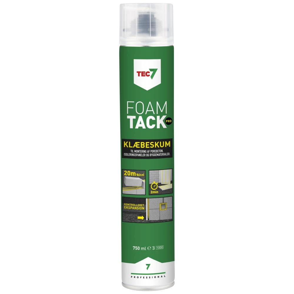 Tec7 FoamTack Pro klæbeskum spray 750ml. FoamTack Pro er et PU-klæbeskum med meget lav efterekspansion til inden- og udendørs brug hele året (fra ÷5°C til +30°C). Førstevalget til samle- og klæbearbejde hvor hastighed, styrke og isoleringsevne er vigtige kvaliteter. God vedhæftning til alle byggematerialer, og med fremragende termisk og akustisk isoleringsevne. Anvendelig til fx klæbning – uden at skabe en kuldebro – af hårde isoleringsplader, cellulære betonblokke og andre bygningselementer, montering af gipsplader på vægge og rammer samt møbelplader og indvendige elementer, samt placering af vindueskarme.