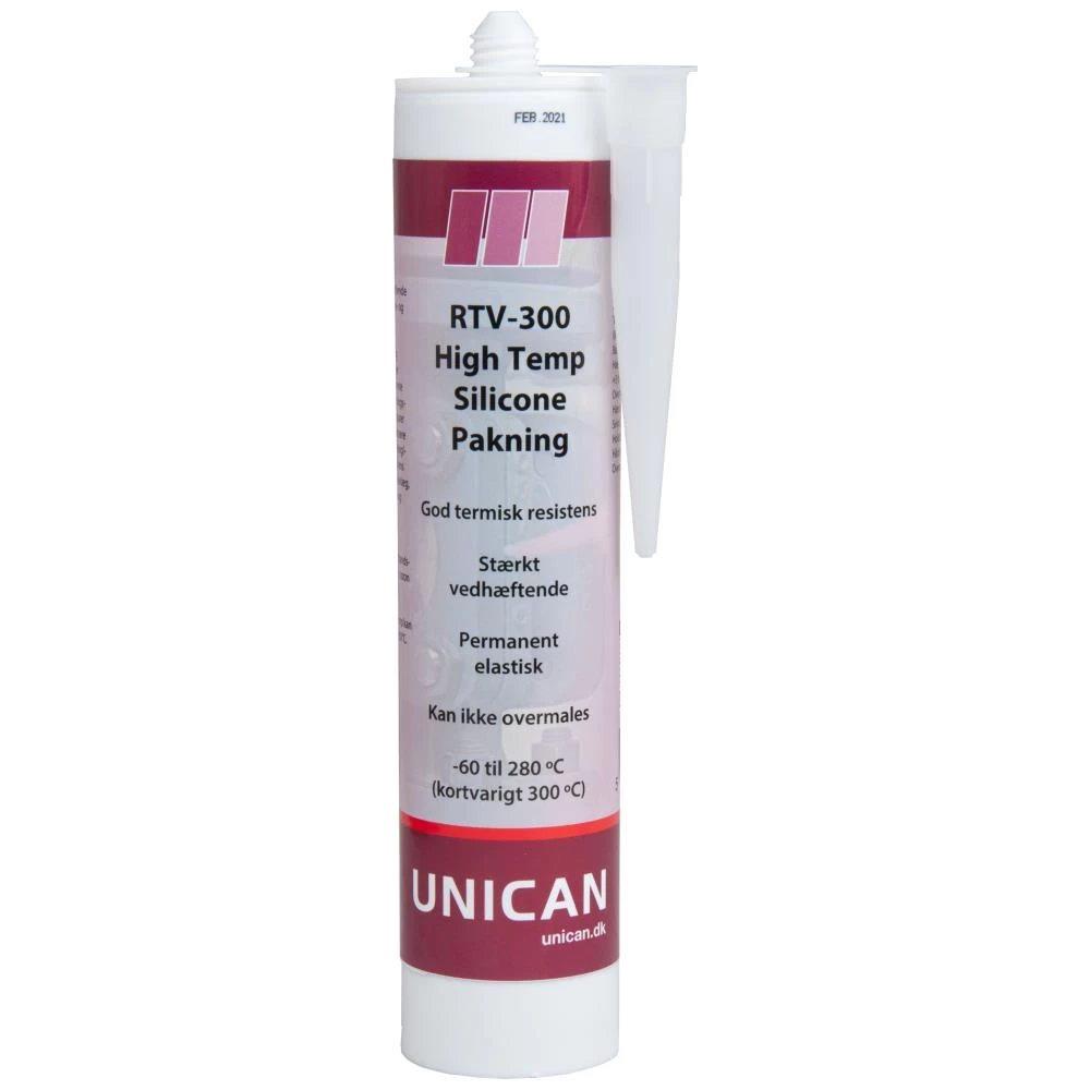 RTV-300 High Temp silikone pakning er en stærkt vedhæftende og vedvarende fleksibel pakke og tætnings- masse. RTV-300 High Temp er særligt temperatur-resistent og bliver normalt anvendt til permanente fleksible forseglings- og limningsopgaver, hvor høje temperaturer forekommer. Produktets primære anvendelse er industriel limning/forseglings-opgaver på såvel ens som uens materialer i varmeanlæg, industrielle ovne, skorstens- og afgasningsrør samt andet industrielt varme udstyr. RTV-300 High Temp kan anvendes til opgaver op til 300°C.