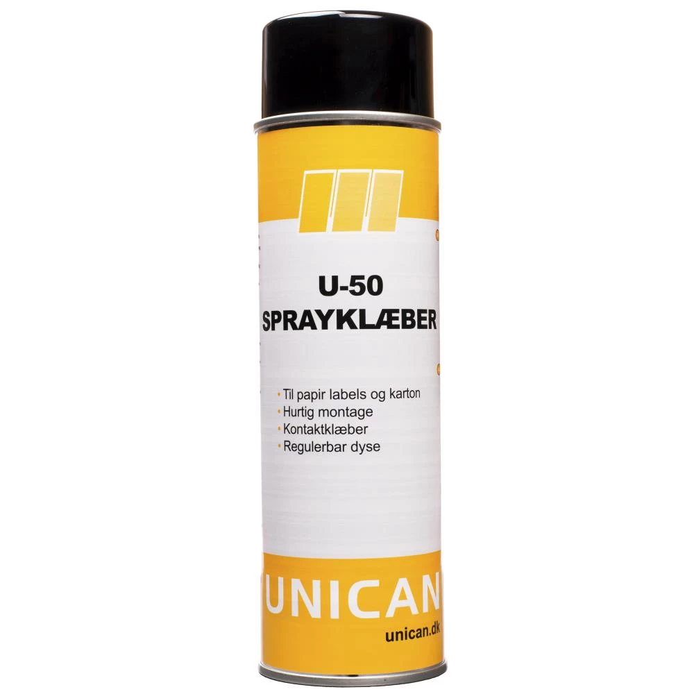 U-50 Sprayklæber er en speciel udviklet industriel klæber, som har til hensigt, at løse klæbe-opgaver i industrien. Produktet kan enten benyttes som en kontaktklæber, hvor de emner, som ønskes limet sammen alle bliver påført produktet, eller også som en traditionel klæber, hvor kun den ene del påføres produktet. U-50 Sprayklæber hæfter på langt de fleste materialer f.eks. læder, pap, tekstiler, træ, metal og glas m.m. Et uundværligt produkt indenfor vedligeholdelse og reparation. For det bedste resultat påføres produktet en rengjort, tør overflade i en afstand af 25-30 cm. Lad limen tørre i 5-10 minutter. Sæt derefter emnerne sammen. I nogle tilfælde er fuld styrke først opnået efter 10-20 timer.