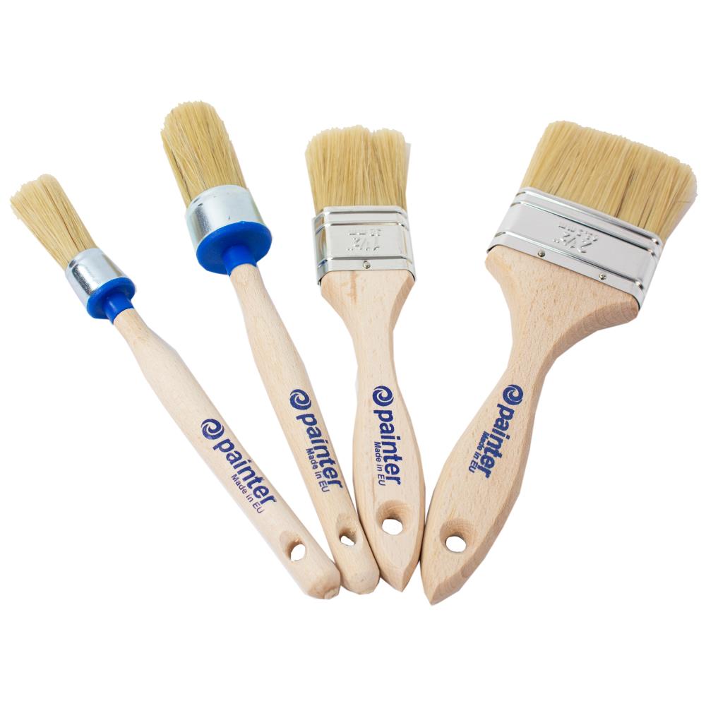 Penselsæt med træskafter og en kombination af både syntetisk fibre og naturhår, hvilket gør penslerne ekstra slidstærke. Sættet består af pensler i 4 forskellige størrelser 1× “1,5” og 1× “2,5” flad, 1× 25 mm og 1× 40 mm rund.