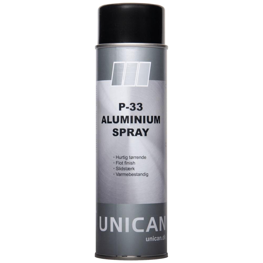 P-33 Aluminiumsspray anvendes til en lang række forskellige reparations og vedligeholdelses-opgaver indenfor industrien. Produktet efterlader den påførte overflade med en flot og yderst slidstærk finish. P-33 Aluminium spray har en fremragende dækkeevne og hæfter på en lang række overflader såsom værktøj, fælge, metaloverflader m.m. Unican P-33 Aluminium spray kan med fordel anvendes sammen med Unican P-55 Lys Primer, P-66 Rødbrun Primer eller P-88 Zinkspray for en yderst kraftig rustbeskyttelse. Produktet påføres på en ren tør overflade, afrens eventuelt emnet med Unican C-1000 Power Cleaner. Påfør produktet i en afstand af 25-30 cm, rengør dysen efter endt brug ved at vende dåsen på hovedet og aktiver dysen i nogle sekunder.