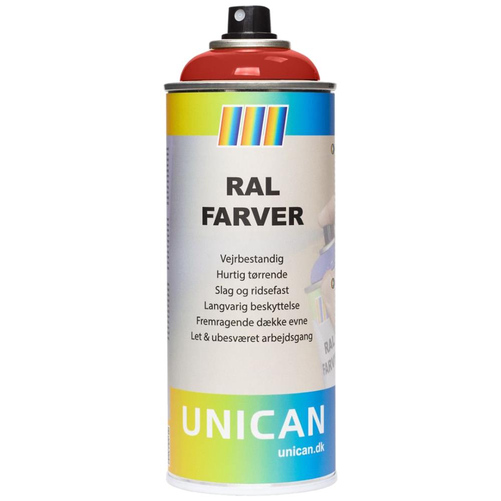 Vejrbestandig, hurtigtørrende RAL-farve spraymaling med særdeles god dækkeevne samt slag- og ridsefaste egenskaber for en langvarig beskyttelse. RAL-farve er yderst velegnet til at give en flot og beskyttende finish på alle former for maskiner, konstruktioner og andet udstyr. RAL-farven kan også bruges som opmærkningsspray på værktøj eller andet, som ønskes markeret. For bedste resultat anvendes Unican P-55 Grå Primer inden påførelse af RAL-farven. Rengør overfladen for fedt og snavs, ryst dåsen omhyggeligt og påfør RALfarven i en afstand af 25-30 cm. Hvis tykkere lag ønskes, kan nyt lag påføres efter ca. 5 minutter. Produktet kan anvendes udendørs eller i et tilstrækkeligt gennemluftet område. Det optimale resultat opnås ved en temperatur mellem 10-25°C og en fugtighedsgrad, der ikke er for høj – helst under 60 %. Rens dysen efter brug ved at spraye 2-3 sekunder med dåsen vendt på hovedet. Fås i flere farver.