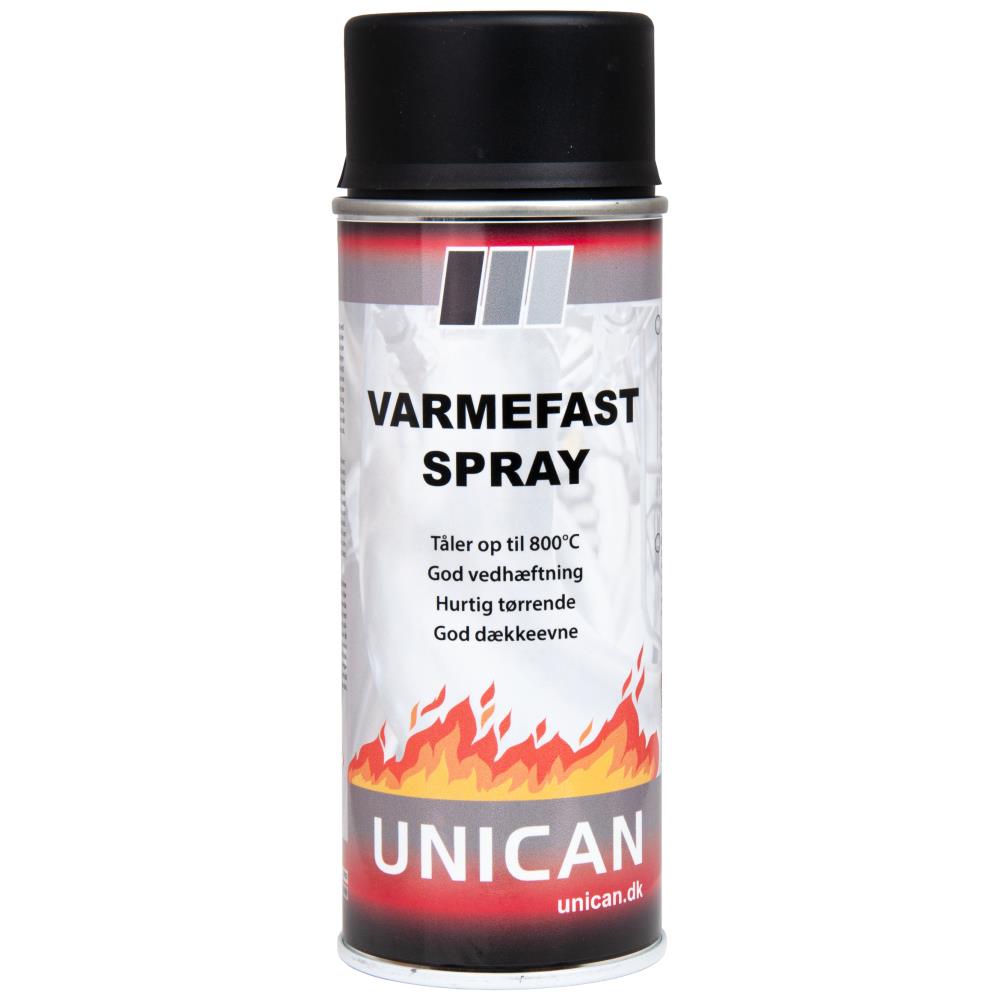 Varmefast Lak tåler 650°C. Det er en varmeresistent lak til overflader, der udsættes for meget høje temperaturer. Slib overfladen og rengør den. Overfladen skal være tør og fuldstændig fri for fedt. Anvend f.eks. Unican C-1000 Power Cleaner. Påfør ikke grunder. Ryst dåsen grundigt og spray på et test stykke. Påfør derefter flere tynde lag. Arbejdstemperatur bør være 15-25°C. Beregn ca. 1 time til tørring ved stuetemperatur. Lakken hærder endeligt når den varmes op til ca. 160°C i ca. 30-60 minutter. Dette kan give en let røgudvikling og er helt normalt under hærdningsprocessen. Lakken kan herefter klare 650°C. Vend dåsen på hovedet og spray ca. 2 sekunder for at rense dysen. Tåler 650°C, hurtig tørrende, god dækkeevne, slidstærk og vandfast, kraftig korrosionsbeskyttelse. Fås i flere farver.