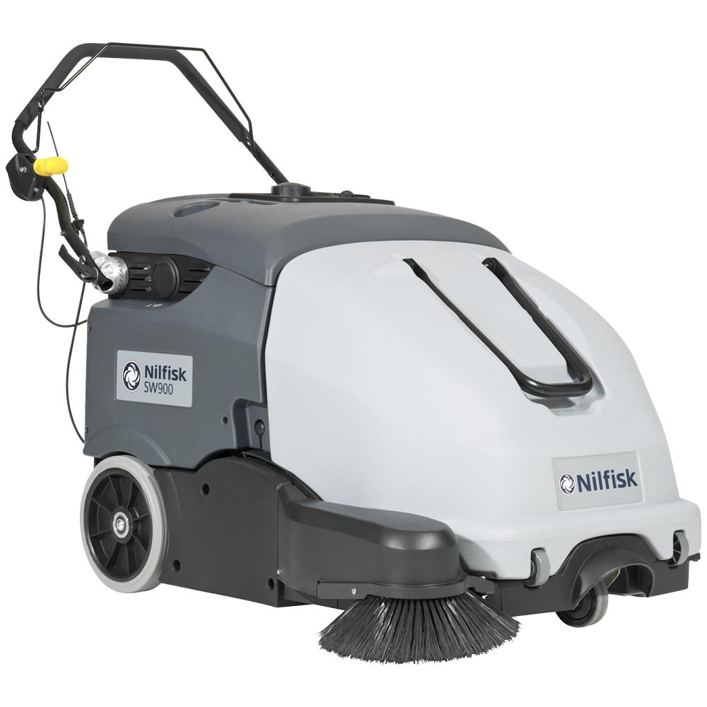 SW900 84B Complete walk-behind feje-/sugemaskine til såvel indendørs som udendørs brug. SW900 er en produktiv og let anvendelig feje-/sugemaskine, til støvfri opfejning af tørt smuds. SW900 er ideel til rengøringsselskaber, industri- og produktionsvirksomheder, skoler og institutioner, lagerbygninger, hoteller, messe- og kongrescentre. Fuldt overblik over hele kontrolpanelet, som er nemt at nå fra førerpladsen. Mere bekvem betjening takket være det ergonomiske håndtag. Let at tilpasse hastigheden: fremdriftsgreb er integreret i håndtaget. Smudsbeholder på hele 60 liter, er let at afmontere. Betjeningshåndtag til sidekosten på kørehåndtaget. Automatisk start/stop, når sidekosten sænkes/hæves. Effektiv elektrisk filterryster for hurtigere og mere effektiv rengøring af filteret.