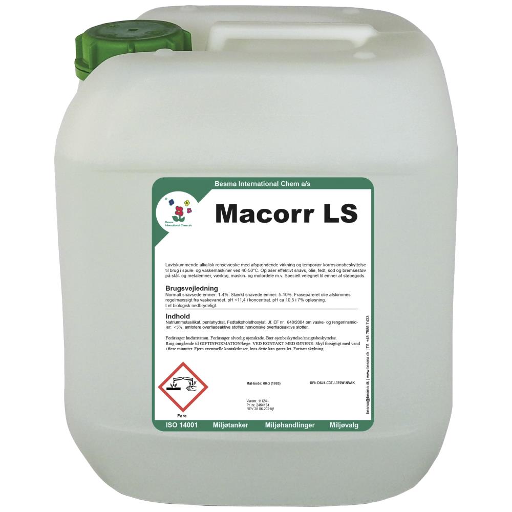 Macorr LS er en lavtskummende alkalisk rensevæske med afspændende virkning og temporær korrosionsbeskyttelse til brug i spule- og vaskemaskiner (40°-50°C). Rensevæsken opløser effektivt snavs, olie, fedt, sod og bremsestøv på stål- og metalemner, værktøj, maskin- og motordele mv. Rensevæsken skal blandes med vand. Fås i flere varianter.