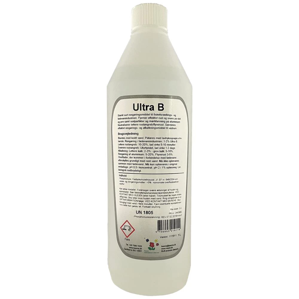 Ultra B er et stærkt, surt rengøringsmiddel til fiskeforædlings- og fødevareindustrien. Ultra B anvendes til sur rengøring af procesudstyr i levnedsmiddelindustrien, fjerner effektivt rust og snavs på stål og jern, fjerner effektivt sodpartikler og mørkfarvning på aluminium og er særdeles effektivt som rengørings- og afkalkningsmiddel i vådrum. Produktet kan også anvendes til polering af rustfrit stål med roterende stålbørste. Fjerner bakterier og flyverust. Ultra B beskytter mod rust i kortere tid (3-4 døgn). Ultra B skal blandes med koldt vand efter behov, påføres med lavtrykssprøjte eller børste og efterskylles med rent vand. Kan misfarve visse typer plast. pH-værdi koncentreret 0,5 og pH-værdi i 1 % opløsning 2,0. Fås i flere varianter.