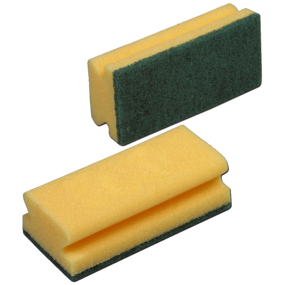 Skuresvamp med håndgreb og grøn skuresål med slibekorn til rensning. Anvendes i våd tilstand. Fremstillet af polyester (skum) og polyester/polyamid (fiber). Hver svamp måler 7×15×5 cm.