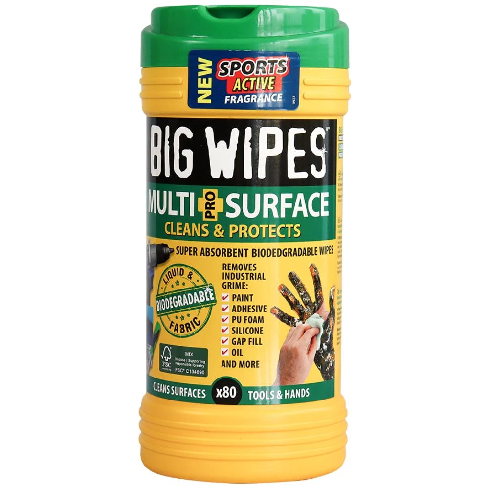 Big Wipes Multi Surface Pro renseservietter til desinficerende og afsluttende rengøring. Fjerner effektivt olie, fedt, lim, maling, PU-skum m.m. Velegnet til både hænder, værktøj og overflader. Indeholder hudvenlige ingredienser som Aloe Vera, lanolin, E-vitamin og glycerin, der beskytter og fugter huden. Dermatologisk testet, 100 % biologisk nedbrydelig og fri for skadelige kemikalier. Praktisk emballage holder servietterne fugtige og klar til brug.