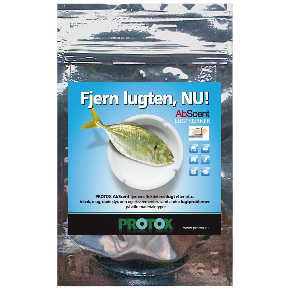 ProtoxAbScent anvendes til fjernelse af restlugt. I vanskelige tilfælde kan kombineres med en afvaskning med produktet ProtoxHysan. ProtoxAbScent leveres i en forseglet alufoliepose. Aluposen åbnes og den vakuumpakkede inderposen åbnes ligeledes, inden den hvide inderste emballage lægges i en skål eller hænges op i rummet. Protox AbScent anvendes indendørs samt i biler og campingvogne til fjernelse af lugt efter fx. mug/skimmel, tobak, døde dyr m.m. ProtoxAbScent fås i 30 grams-poser.