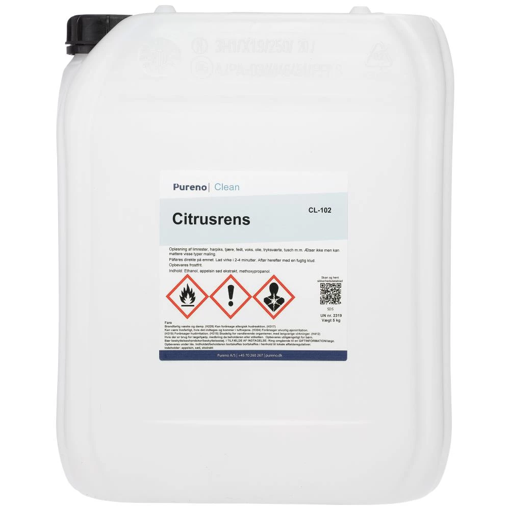 Citrusrens er baseret på citrusolie. Produktet opløser effektivt limrester, harpiks, tjære, fedt, voks, olie, tryksværte, tusch m.m. Citrusrens er yderst velegnet til opløsning og frigørelse af etiketter og labels. Kan anvendes på alle overflader. Citrusrens ætser ikke, men kan mattere visse typer maling. Citrusrens er pH neutralt.