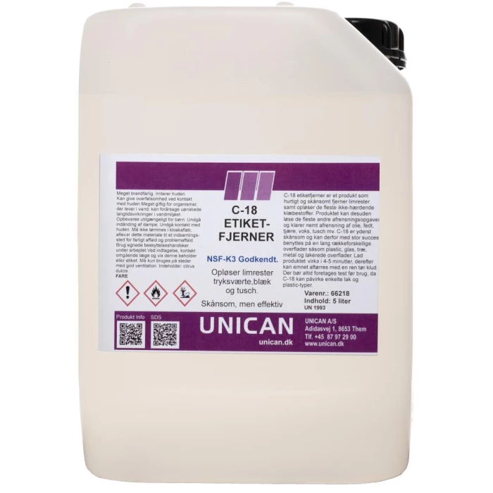 C-18 etiketfjerner er et produkt som hurtigt og skånsomt fjerner limrester samt opløser de fleste ikke-hærdende klæbestoffer. Produktet kan desuden løse de fleste andre afrensningsopgaver og klarer nemt afrensning af olie, fedt, tjære, voks, tusch mv. C-18 er yderst skånsom og kan derfor med stor succes benyttes på en lang række forskellige overflader såsom plastik, glas, træ, metal og lakerede overflader. Ved fjernelse af etiketter samt limrester sprayes C-18 på det punkt, som ønskes afrenset. Lad produktet virke i 4-5 minutter, derefter kan emnet aftørres med en ren tør klud. Der bør altid foretages test før brug, da C-18 kan påvirke enkelte lak og plastik-typer.