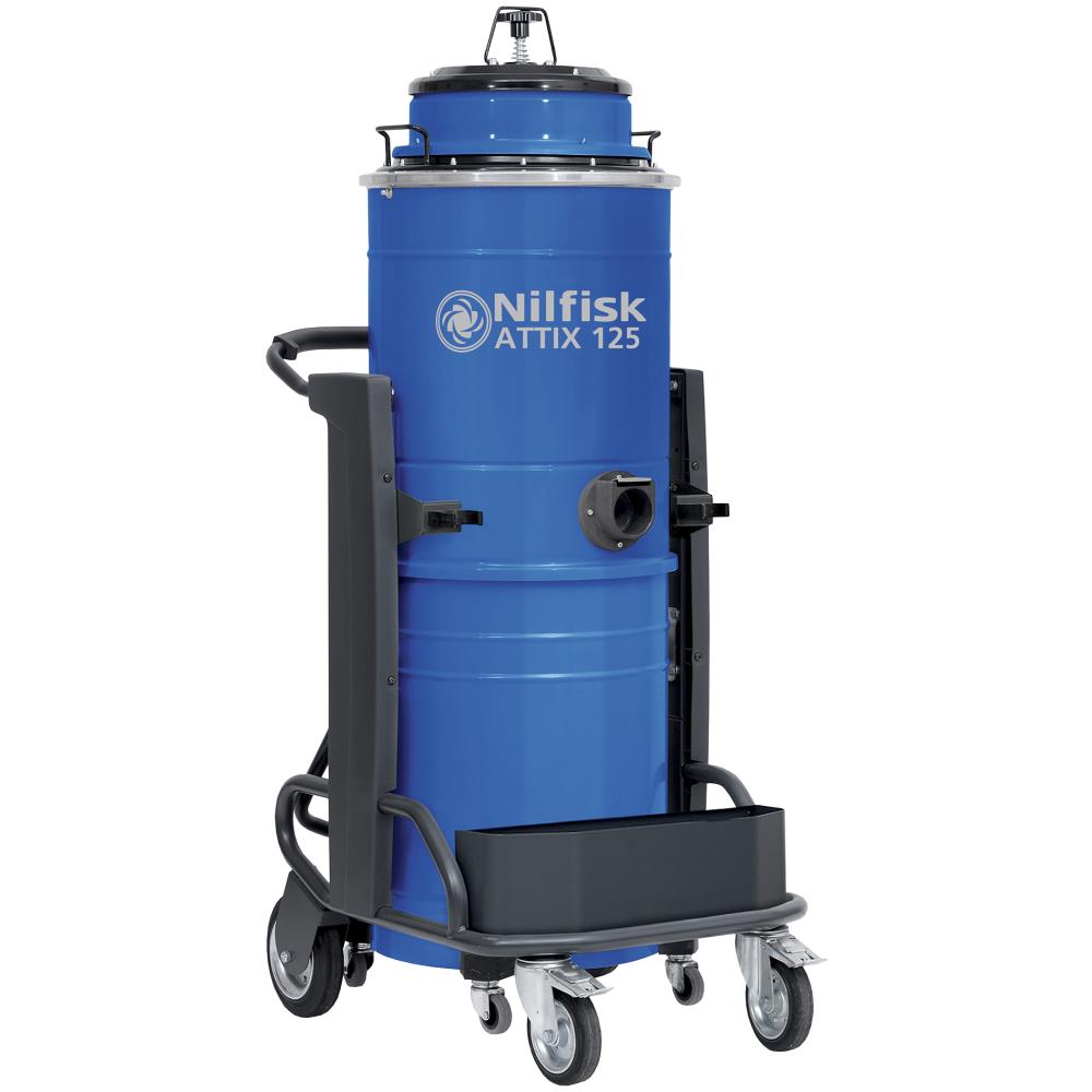 ATTIX 125 er en simpel 1-faset heavy-duty våd-/tørsuger med stor kapacitet, høj ydeevne og robust design. Velegnet til opsugning af metalspåner, olie og væsker eller indenfor bygge-/anlægsindustrien til opsamling af fint støv. ATTIX 125-01 er drevet af 3 selvkølende by-pass motorer på hver 1.000 watt, der kan aktiveres enkeltvis. Opgavens beskaffenhed bestemmer, om det er nødvendigt at køre med én, to eller tre motorer. Støvsugeren er let at manøvrere og er udstyret med diverse holdere til slange og rør. Stort stjernefilter og filterryster sikrer optimal filtrering. Robust udløsersystem til den aftagelige 100-liters beholder med drejehjul. ATTIX 125: M-klasse filter (H-klasse filter eller HEPA filter fås som ekstraudstyr). Praktisk tilbehørskurv. Stort tilbehørsprogram giver optimal fleksibilitet (leveres uden tilbehør).