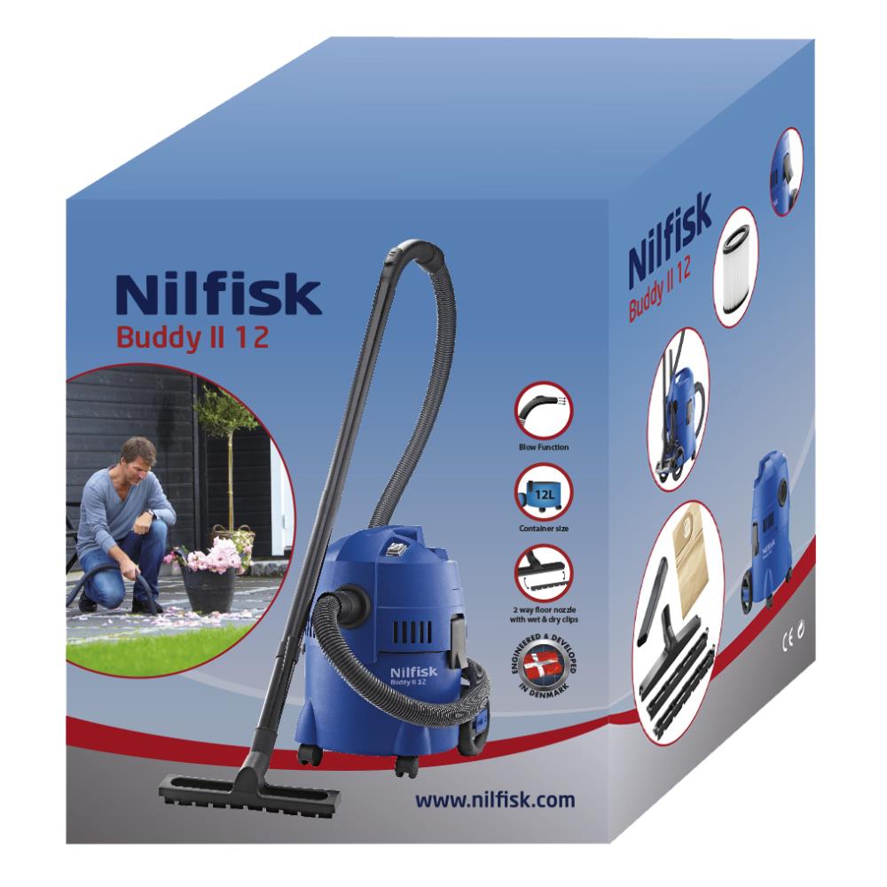 Støvsuger Buddy II 12. Buddy II er en handy hjælper mod al slags snavs, uanset om det er vådt eller tørt. Buddy er en lille, kompakt støvsuger til brug i hjemmet, værkstedet eller til hobbybrug. Modellen er udstyret med et fleece-filterposesystem til selv fugtigt snavs. Letvægtsmodel der er nem at komme rundt med – to drejehjul og to kørehjul giver god stabilitet. 1.200 watt motor til opsug af stort set alt slags snavs. Våd- og tørfilter beskytter motoren og giver længere levetid. Stor, brugervenlig tænd/sluk kontakt. Blæsefunktion. Komfortabelt placeret slangetilslutning. 1,9 mtr. ø36 mm sugeslange med sugestyrkeregulering og rørbøjning. Drejeled på støvsugerslangen. Dørtrinsglider: Stabil kørsel over dørtærskler. Smart kliksystem for hurtig skift af tilbehør. Tilbehørsholdere. Fås i flere varianter.
