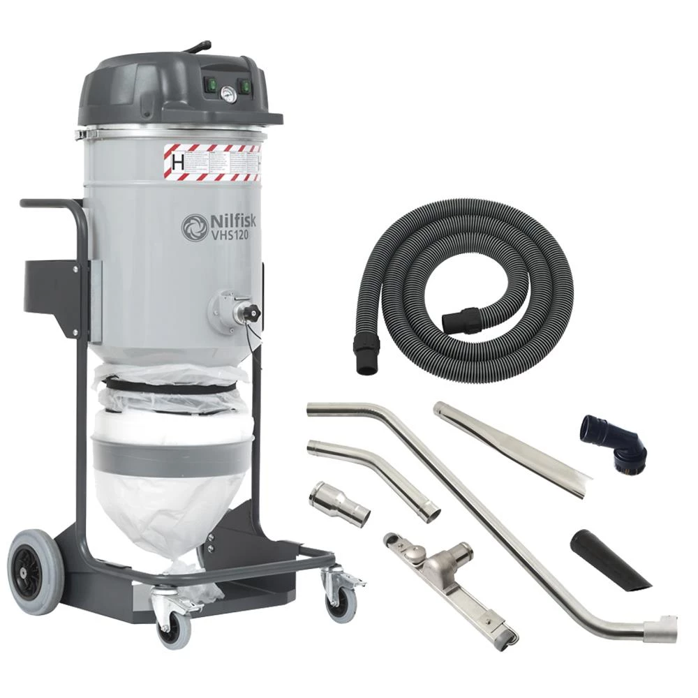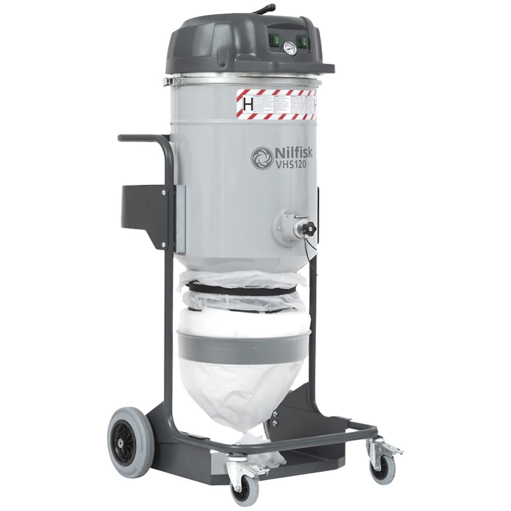 VHS120 All-In-One Building & Construction er en effektiv og enkel våd-/tørsuger godkendt til sundhedsskadeligt H-klasse støv og mikroskopiske partikler. Den har Longopac posesystem, der er optimalt til farligt støv og sikker bortskaffelse af det opsamlede materiale. Materialerne opsamles direkte i ”endeløse” polyethylenposer, som kan lukkes og bortskaffes. Rengøringen foregår sikkert og uden at medarbejderen kommer i kontakt med det opsamlede materiale. Maskinen er en 1 faset , 2 motors H klasse støvsuger med transportvenlige dimensioner. M-klasse stjernefilter med manuel filterrensning. Stort filterareal. Vakuum måler på motortop. H-klasse filter. 5 mtr. antistatisk slange og antistatisk tilbehør.