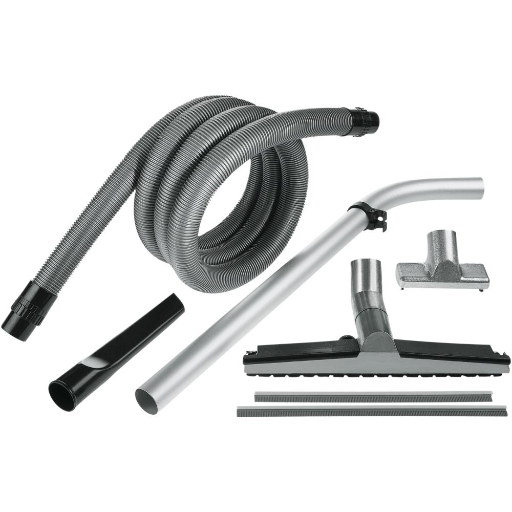 Industrisæt til støvsuger. Sættet består af 6 dele (ø50 mm): 4 mtr. universal-sugeslange, 1 mtr. forlængerrør eloxeret, aluminium, 50 mm bredt gulvmundstykke i aluminium til tørsugning, ekstra læber til vådsugning, fugemundstykke i slagfast plast og aluminiums-børstemundstykke til grovsugning.