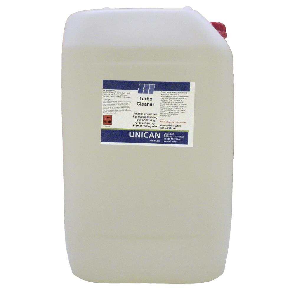 Turbo Cleaner er en stærk alkalisk grundrens. Anvendes til grovrengøring, som totalaffedter før maling/lakering samt som fedt- og oliefjerner. Turbo Cleaner er et effektivt højtryksrensemiddel, som fjerner fedt, olie, talg m.m. indenfor fiskeri-, auto-, gartneri-, metal- og slagterisektoren. Produktet er velegnet til affedtning af malede overflader før genmaling og kan desuden fjerne/opløse silikonerester. Obs: Kan skade/misfarve letmetaller. Fås i flere varianter.