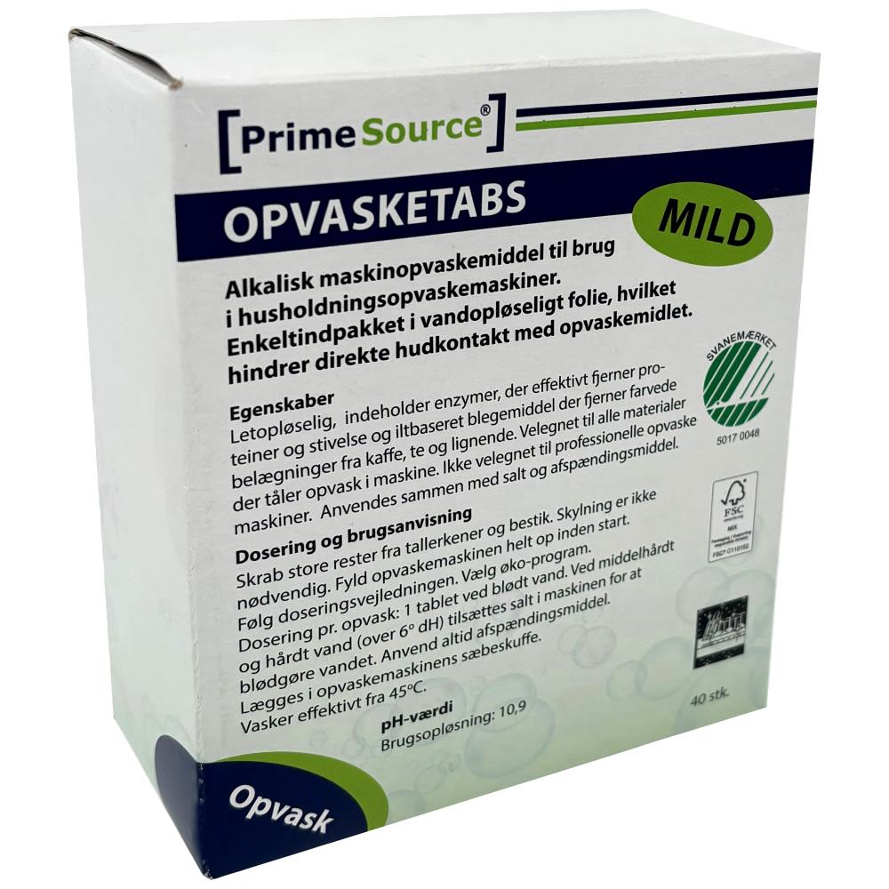 PrimeSource Mild tabs til maskinopvask. Alkalisk maskinopvaskemiddel til brug i husholdningsopvaskemaskiner. Tabs er indpakket i vandopløselig folie, hvilket hindrer hudkontakt med vaskemidlet. Indeholder enzymer og blegemiddel som effektivt fjerner proteiner og pletter (f.eks. te, kaffe mv.). Velegnet til alle materialer som tåler maskinopvask. Ikke velegnet til professionelle opvaskemaskiner. Skal bruges sammen med afspændingsmiddel. Svanemærket.