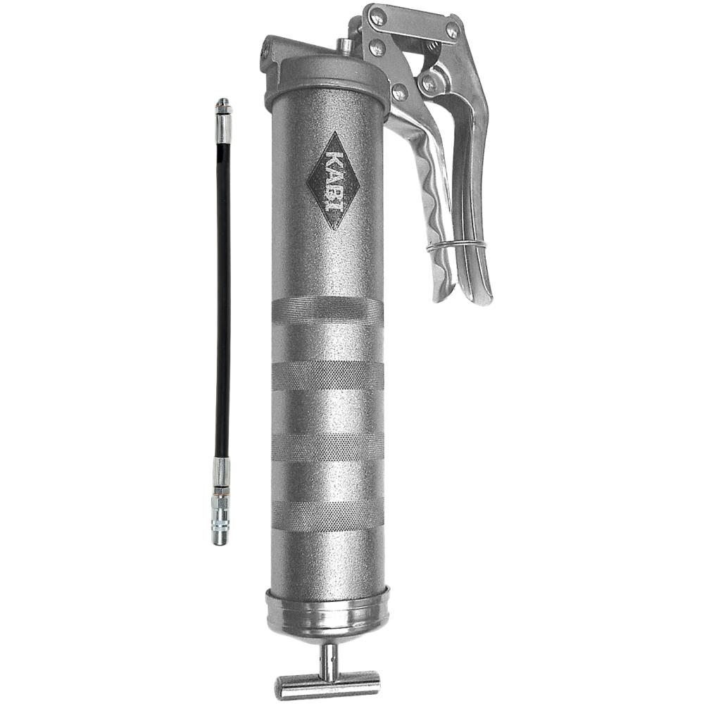 KABI enhånds fedtpresser 450. Kan anvendes til såvel patroner som løst fedt samt fyldning fra fedtfylder. Max. ydelse 345 Bar. Leverer ca. 0,5 g. pr. slag. Med 300 mm slange samt 4-bakket smørehoved. Tilslutningsgevind 1/8″R. Indhold 400/500 gram. Leveres i kartonæske.