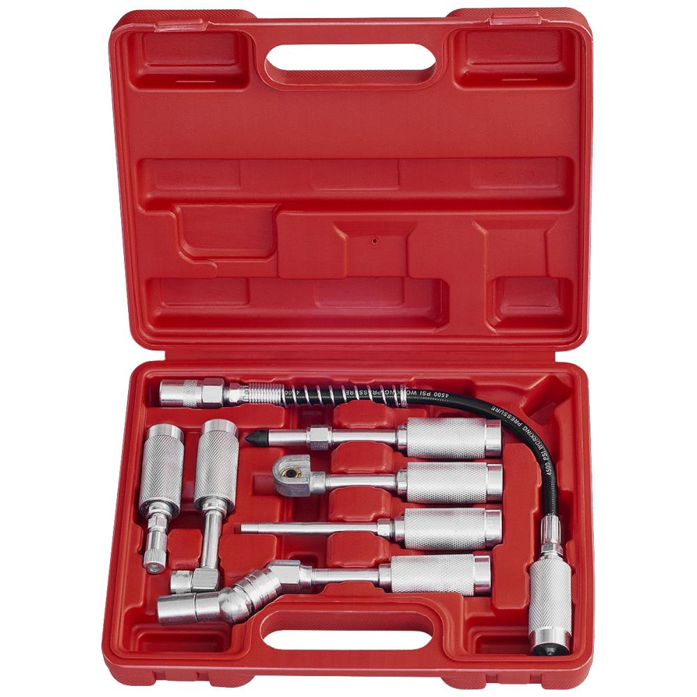 Montørsæt med de syv mest brugte smøremundstykker med lynkobling, der blot klikkes på fedtpressens smørehoved – og så er den klar til brug. Leveres i praktisk kuffert.