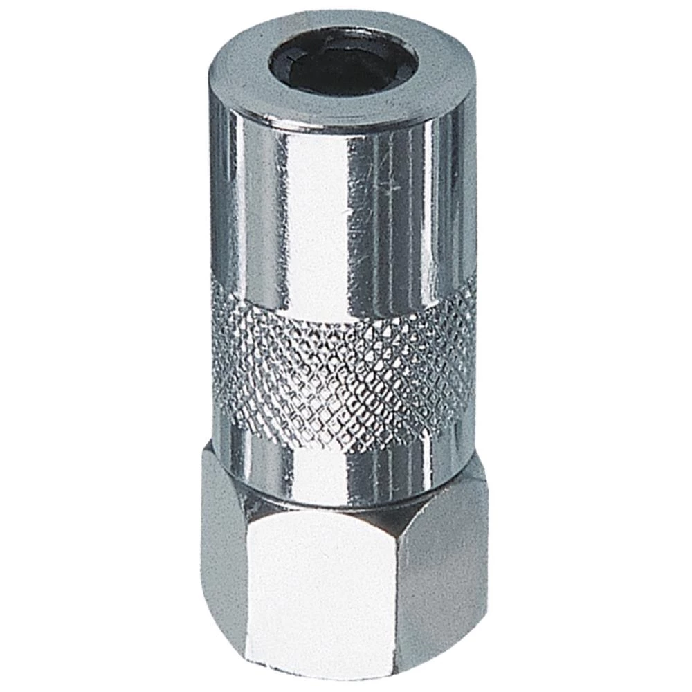 Smørehoved med tre kæber i stål (ø15 mm) og standard 1/8″ R tilslutning (for H nipler). DIN 71412.