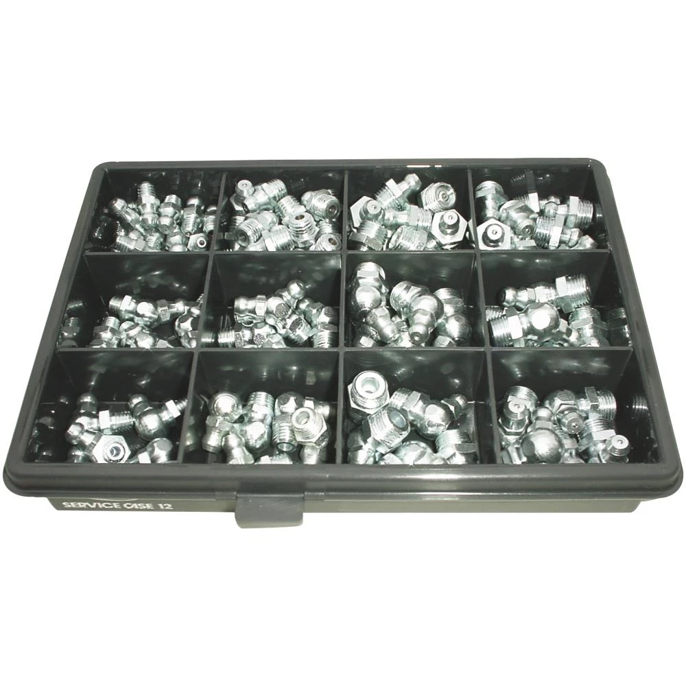 Tryksmørenipler i sortiments-boks 120 stk. Tryksmørenipler af el galvaniseret stål fordelt på 12 rum. Indeholder H1, H2 og H3 med gevind typerne: H1: M6x1.0 – M8x1.0 – M10x1.0 & 1/8″R. H2: M6x1.0 – M8x1.0 – M10x1.0 & 1/8″R. H3: M6x1.0 – M8x1.0 – M10x1.0 & 1/8″R. Fås i flere varianter.