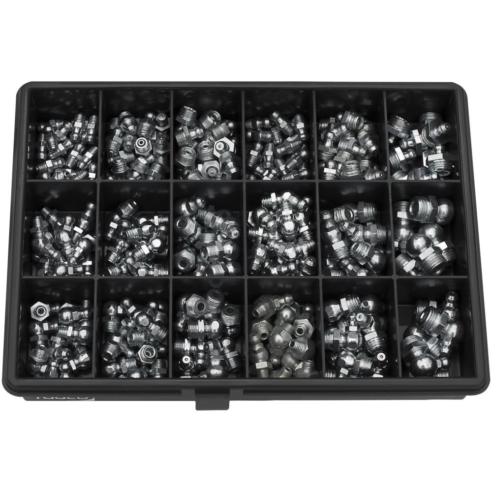 Tryksmørenipler i sortiments-boks 240 stk. tryksmørenipler af elgalvaniseret stål fordelt på 18 rum. Indeholder H1, H2 og H3 med gevind typerne: H1. M6x1.0, M8x1.0, M10x1.5, 1/8″R, 1/4″R & 1/4″SAE. H2. M6x1.0, M8x1.25, M10x1.5, 1/8″R, 1/4″R & 1/4″WW H3. M6x1.0, M8x1.25, M10x1.5, 1/8″R, 1/4″R & 1/4″BSF