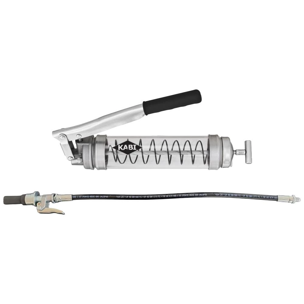 Vægtstangsfedtpresse med transparant cylinder til 400 g patroner og smørehoved med Quick-lås til nem og stabil fedtsmøring. Arbejdstryk 550 bar (8.000 psi) til smørehoved. Maks. tryk 600 bar (10.000 psi) til vægtstangsfedtpressen.
