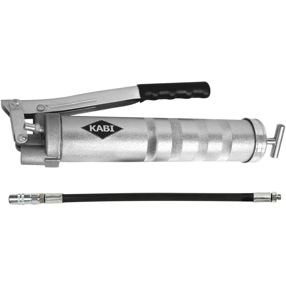 KABI vægtstangsfedtpresser 400. Vægtstangsfedtpresseren er forsynet med fyldenippel, hvilket betyder, at den kan anvendes til såvel patroner, opsugning af fedt fra fade samt fyldning fra fedtfylder. Leveres med 300 mm. slange samt 4-bakket smøremundstykke. Max. ydelse 400 bar. Tilslutningsgevind 1/8″R. Indhold 400/500 gr. Leveres i karton