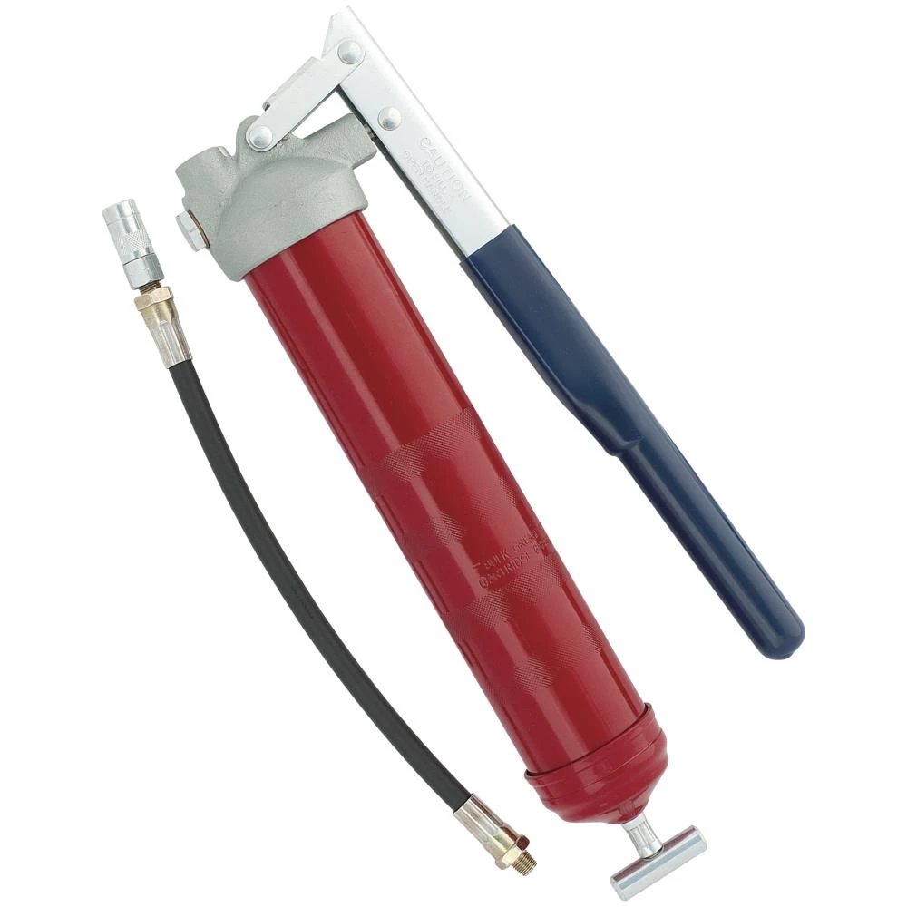 Heavy Duty vægtstangsfedtpresser. Vægtstangsfedtpresseren er forsynet med trykstang og vendbar stempellæbe til brug med løst fedt samt fyldenippel, hvilket betyder, at den kan anvendes til såvel patroner som fyldning fra fedtfylder. Leveres med 300 mm slange samt 4-bakket smørehoved. Leverer ca. 1 gr. pr. pumpeslag. Max. ydelse 690 bar. Tilslutningsgevind 1/8″R. Indhold 400/500 gram. Leveres i kartonæske.