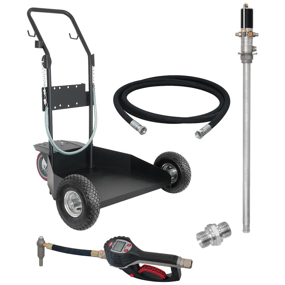 Mobilt olieanlæg med digital oliepistol for 180-205 ltr. olietromler. Inkl. 3:1 trykluftdrevet oliepumpe, 4 mtr. olieslange, digital oliepistol (40385), transportvogn, samt diverse fittings. NB pumpen skal forsynes med tågesmøring (FRL unit) 60286.