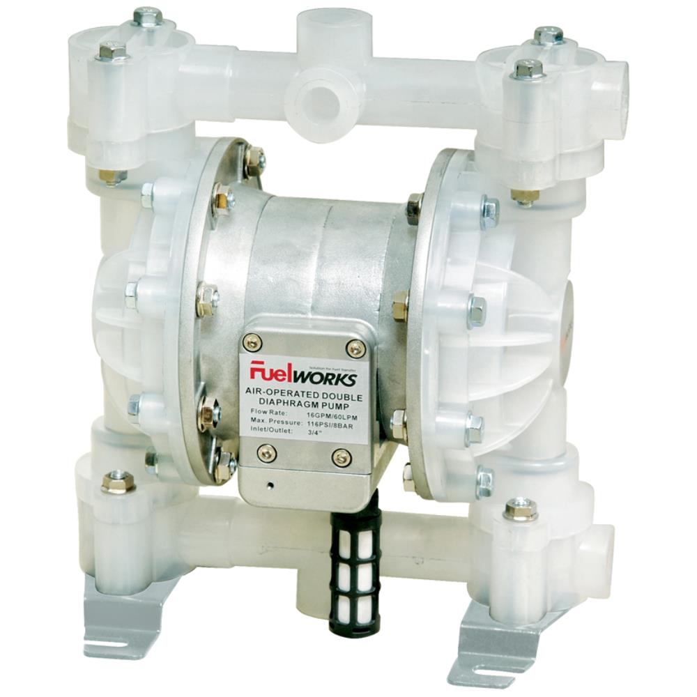 Pneumatisk membranpumpe – kemikalieresistent og alsidig. Robust pumpe i plast til olie, kemi, AdBlue, auto og industri. Servicevenligt luftsystem og boltet konstruktion. Maks. tryk 8 bar / 115 PSI. Løftehøjde 50 mtr. Sugehøjde 3 mtr. Luftindgang 1/4″.