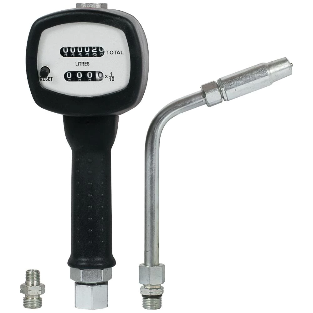 Oliepåfyldningspistol med analog visning, antidrypventil og indbygget drejeled og filter. Udløbsstuds 90°, ø16 mm. Målenøjagtighed ±1 %. Tilslutning 1/2″ R (indv.).