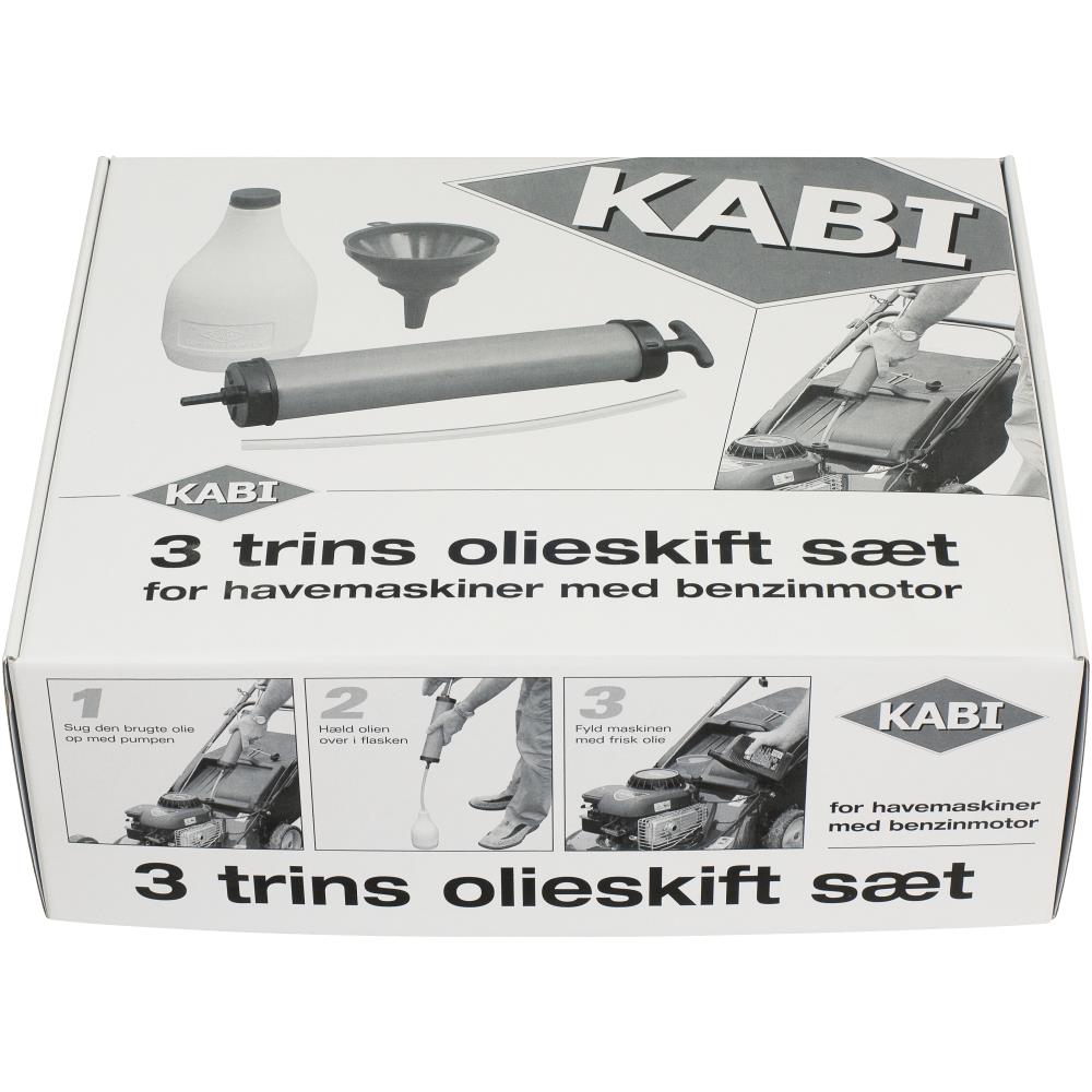 KABI 3 trins Olieskift sæt. For havemaskiner med benzinmotor. KABI introducerer markedets mest solide 3 trins olieskift sæt for havemaskiner med benzinmotor. Sættet inkluderer: ø100mm tragt, 0,7l Polyethylen beholder med kapsel, Kraftig 0,5l sugepumpe med transparent sugeslange. Sættet udmærker sig ved at sugepumpens volumen gør det muligt at opsuge alt brugt olie på en gang, i modsætning til andre mærker på markedet, hvor det tager 3-5 gange så lang tid.