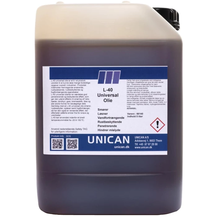 L-40 Universal Olie er et multifunktions produkt, udviklet til at kunne løse mange forskellige opgaver overalt i industrien. Produktet indeholder fremragende smørende, rustopløsende, rustbeskyttende og fugtfortrængende egenskaber. L-40 Universal Olie har en særdeles god penetrerende og beskyttende effekt, som gør den yderst effektiv til smøring af f.eks. kæder, tandhjul, gear, bremsedele, låse og alle andre former for bevægelige dele. Produktet kan også anvendes som midlertidig formbeskyttelse indenfor plastindustrien. Samtidig med at L-40 Universal Olie smører, rustbeskytter, opløser samt fugtfortrænger, så har den også en rensende effekt, der efterlader påførte emner frie for snavs, fedt og sod mv. Produktet kan også effektivt bruges til afhjælpning af startproblemer i køretøjer, som oftest skyldes krybestrøm på grund af fugt i strømfordeleren. L-40 kan anvendes indenfor et bredt temperaturområde fra -20°C til 150°C.