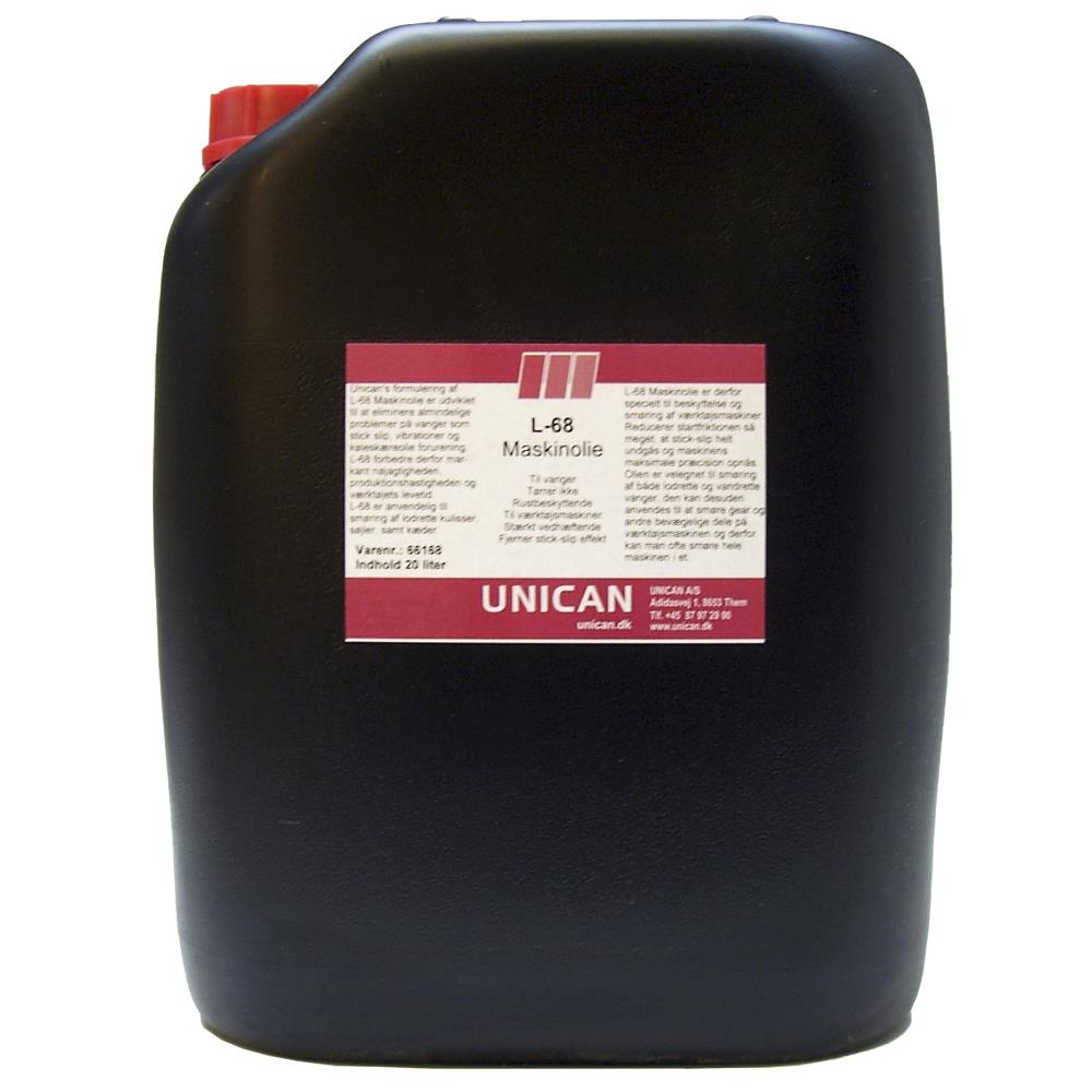 Vangeolie. Unican’s formulering af L-68 maskinolie er udviklet til at eliminere almindelige problemer på vanger som rust, stick-slip, vibrationer og køleskæreolie forurening. L-68 forbedrer derfor markant nøjagtigheden, produktionshastigheden og værktøjets levetid. L-68 maskinolie er derfor specielt velegnet til beskyttelse og smøring af værktøjsmaskiner. Reducerer startfriktionen så meget, at stick-slip helt undgås og maskinens maksimale præcision opnås. Olien er velegnet til smøring af både lodrette og vandrette vanger, den kan desuden anvendes til at smøre gear og andre bevægelige dele på værktøjsmaskinen og derfor kan man ofte smøre hele maskinen i et. L-68 er anvendelig til smøring af lodrette kulisser, søjler, samt kæder og maskiner, der stiller særlige krav om en vedhæftede smøring. Fås i flere varianter.
