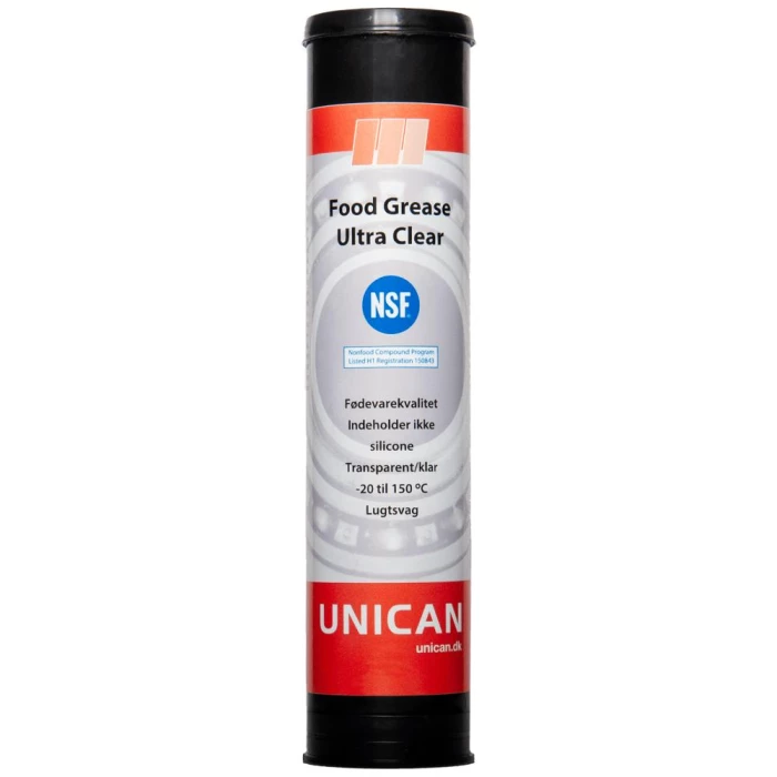 NSF-H1 Godkendt. Food Grease Ultra Clear er en specialfedt udviklet til fødevareindustrien. Fedten er transparent og bygget op på hvide mineralolier og en aluminium-komplekssæbe som fortykningsmiddel. Hvis der under fødevareproduktion opstår en tilfældig kontakt med fødevarer, vil fedten normalt ikke påvirke hverken farve, lugt eller smag af fødevaren. Food Grease Ultra Clear indeholder en FDA-godkendt oxidation inhibitor, som giver høj stabilitet mod kemiske ændringer. Produktet indeholder også rust inhibitor, som beskytter lejer og metaloverflader udsat for våde forhold, luftfugtighed og vask med vand eller damp. Fedten modstår udvaskning og giver en forsegling af lejet mod indtrængende vand eller forarbejdningsvæsker. Fordi den er forenelig med drikkevarer og andre fødevarevæsker, fastholder Food Grease Ultra Clear sin konsistens. Fedten virker effektivt indenfor et temperaturområde fra -20°C til +150°C.